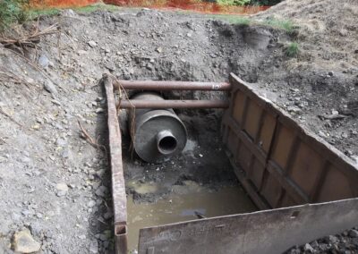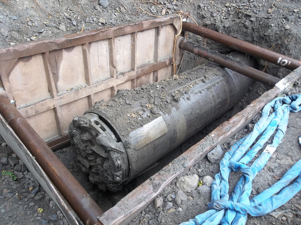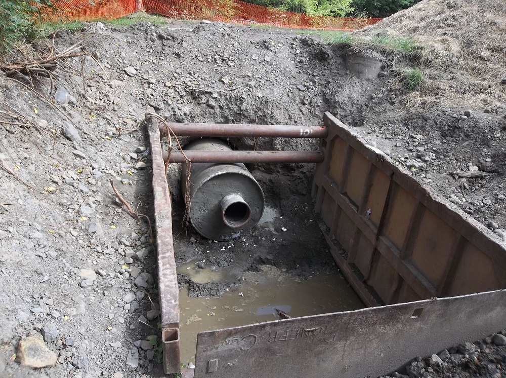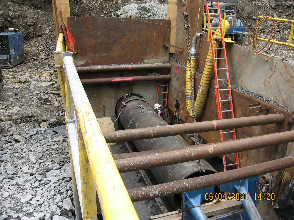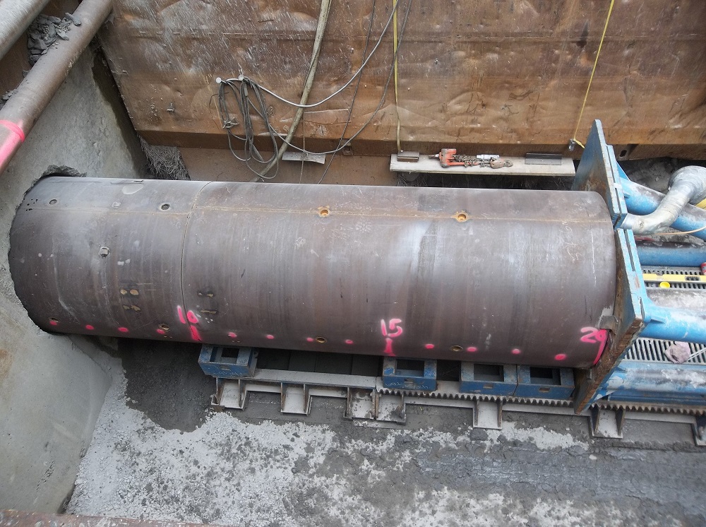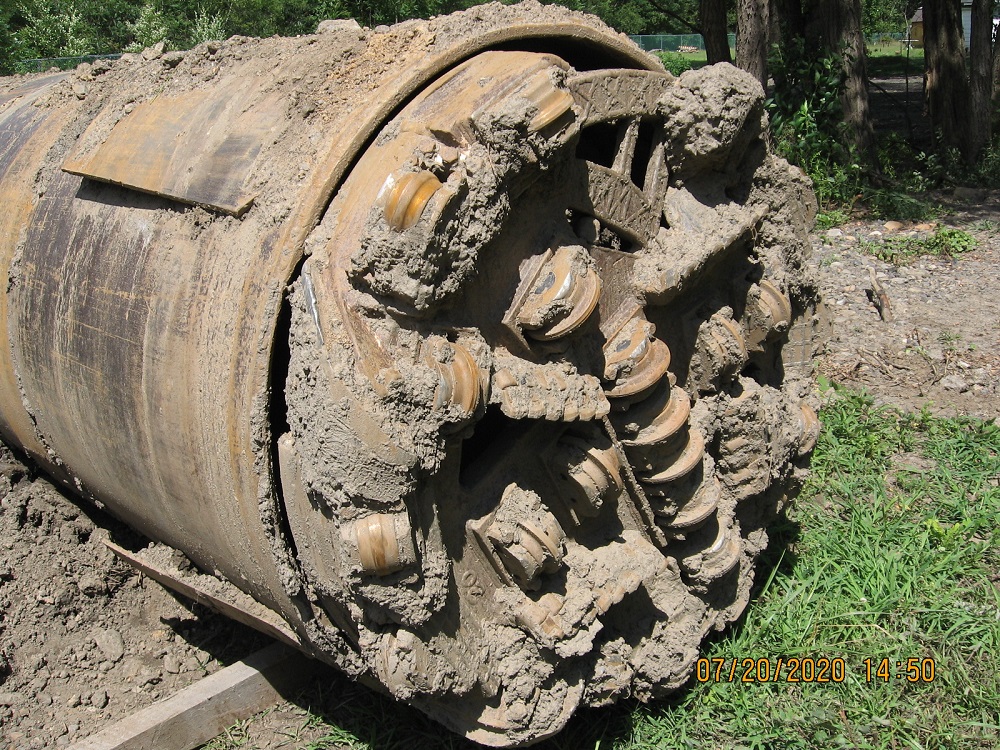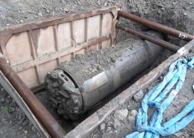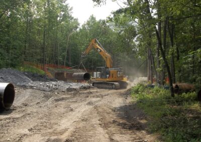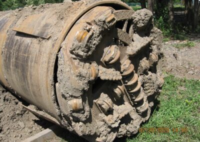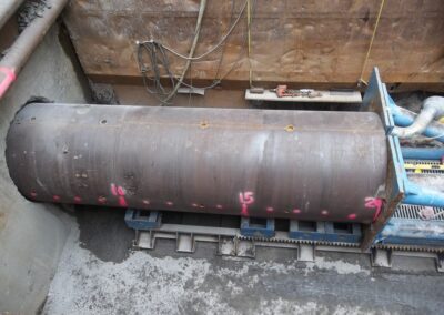A standout feature of the project was the construction of a 412-foot-long bore beneath an existing railroad embankment to install the new sewer line under active railroad tracks. The 54” diameter bore was completed using a tunnel boring machine through both earthen and rock embankments. The bore was lined with a steel casing, allowing the new 16” sewer pipe to be installed inside it. This design ensures that the sewer line remains accessible for future maintenance or replacement without disrupting railroad operations.