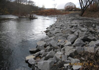 The LRBSA’s interceptor is the primary trunk line that transports wastewater from its furthest point in Archbald Borough to the treatment plant in Throop. Along its route, the interceptor collects wastewater from various communities along the Lackawanna River. The pipe increases in size from 12” to a maximum of 36” in diameter as it carries the growing volume of wastewater from each successive town. Since the interceptor is located along the river, it is vulnerable to changes in the river’s course, including erosion of the riverbank. When erosion threatens the interceptor, the LRBSA takes immediate action to repair the riverbank and protect the pipeline. In this case, approximately 702 feet of riverbank were reinforced with large rocks, or “riprap,” to prevent further erosion and safeguard the sewer line.