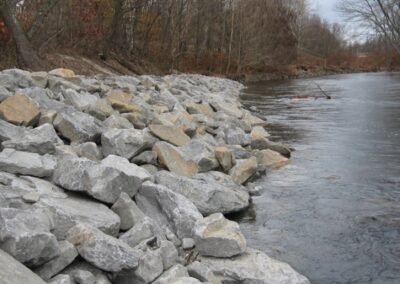 Approximately 357 linear feet of streambank along the Lackawanna River were stabilized and reinforced with rock lining to prevent further erosion and protect the LRBSA’s interceptor pipe, which runs along the river.